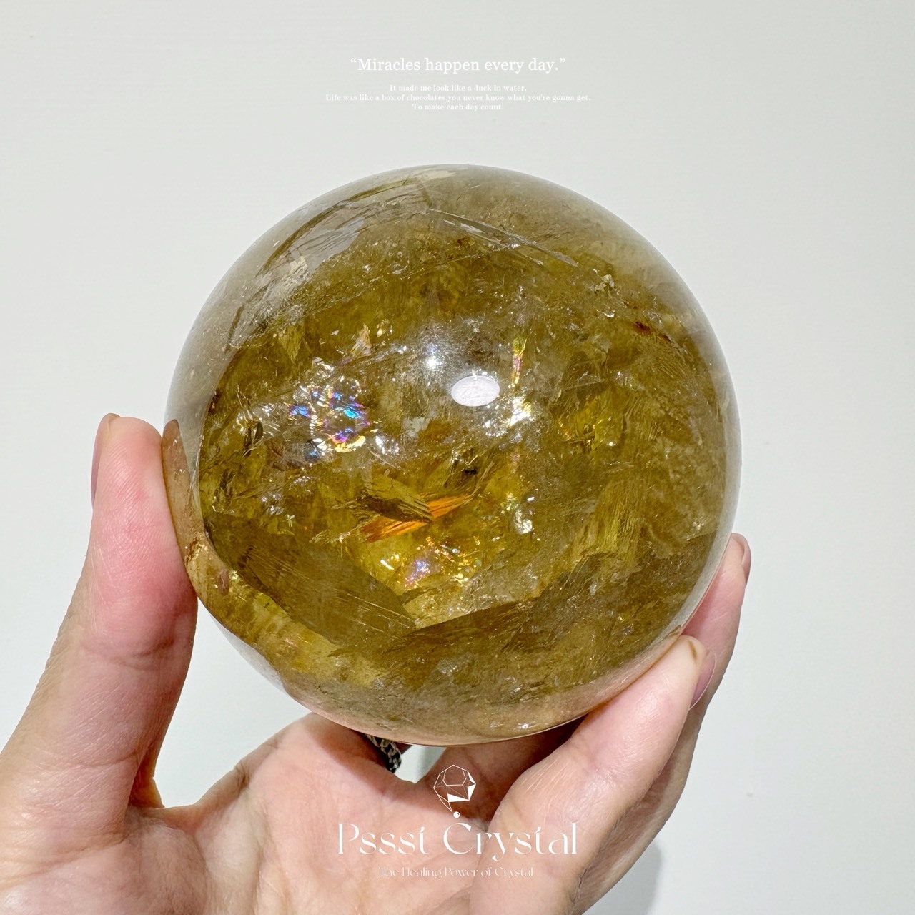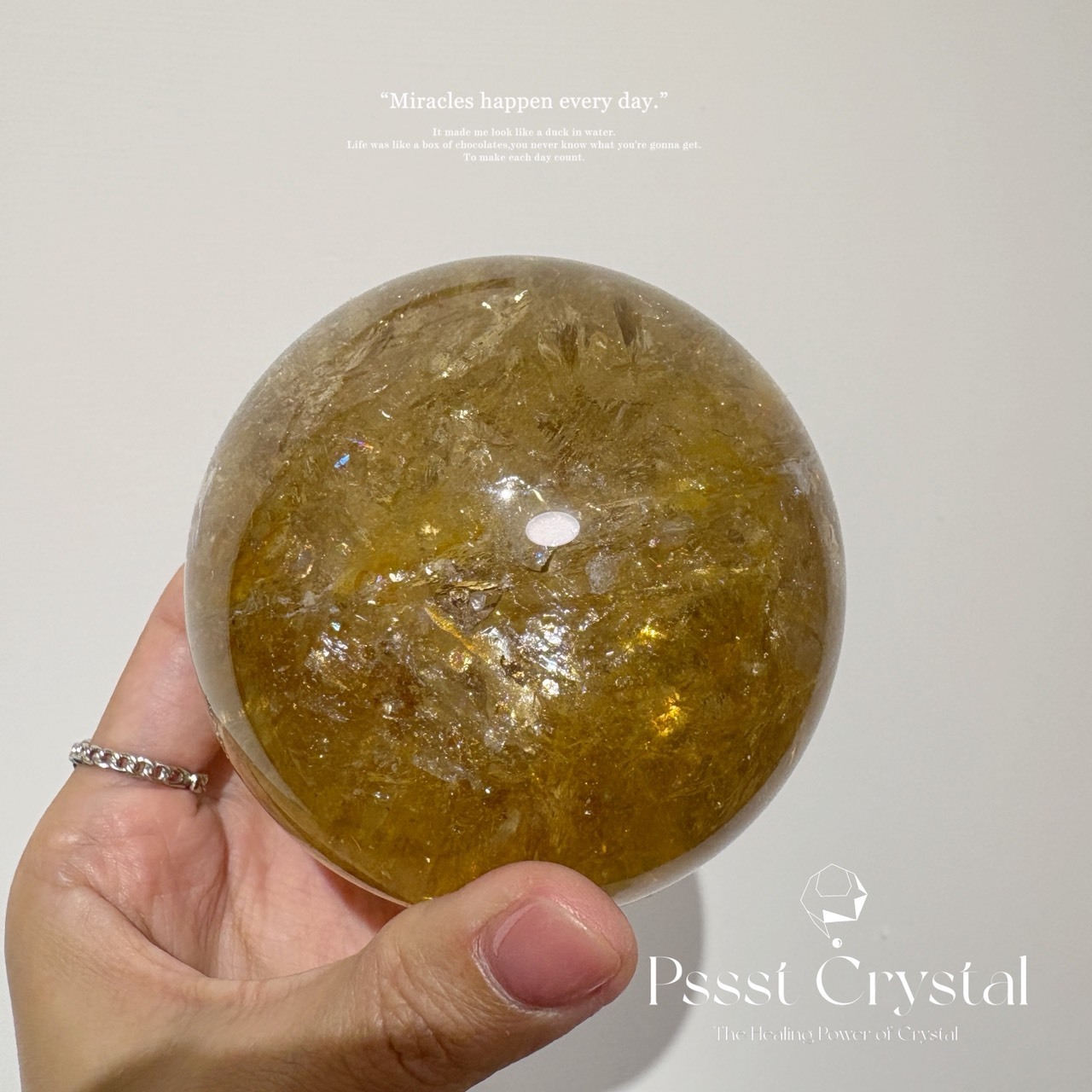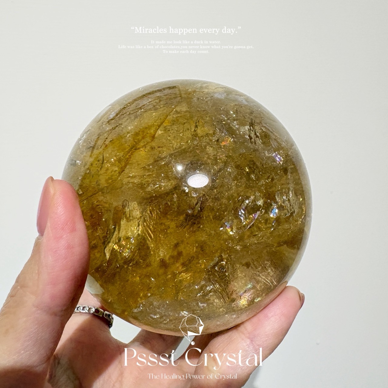 圓潤晶透的黃水晶球,散發著如陽光般的金黃能量,象徵圓滿與富足。